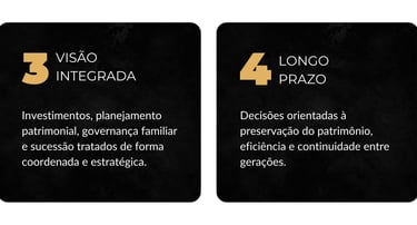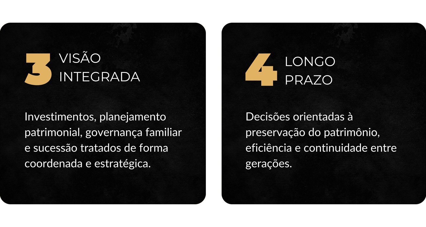Atuamos como parceiros de longo prazo, coordenando decisões financeiras, patrimoniais e sucessórias com visão global, confidencialidade absoluta e foco na preservação e no crescimento sustentável do patrimônio ao longo das gerações.