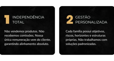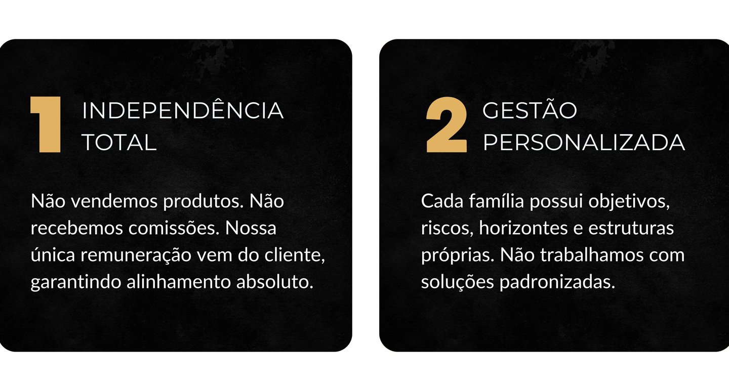 Somos uma Multi Family Office independente, criada para atender famílias e indivíduos com patrimônio relevante que buscam uma gestão estruturada, estratégica e alinhada aos seus valores.